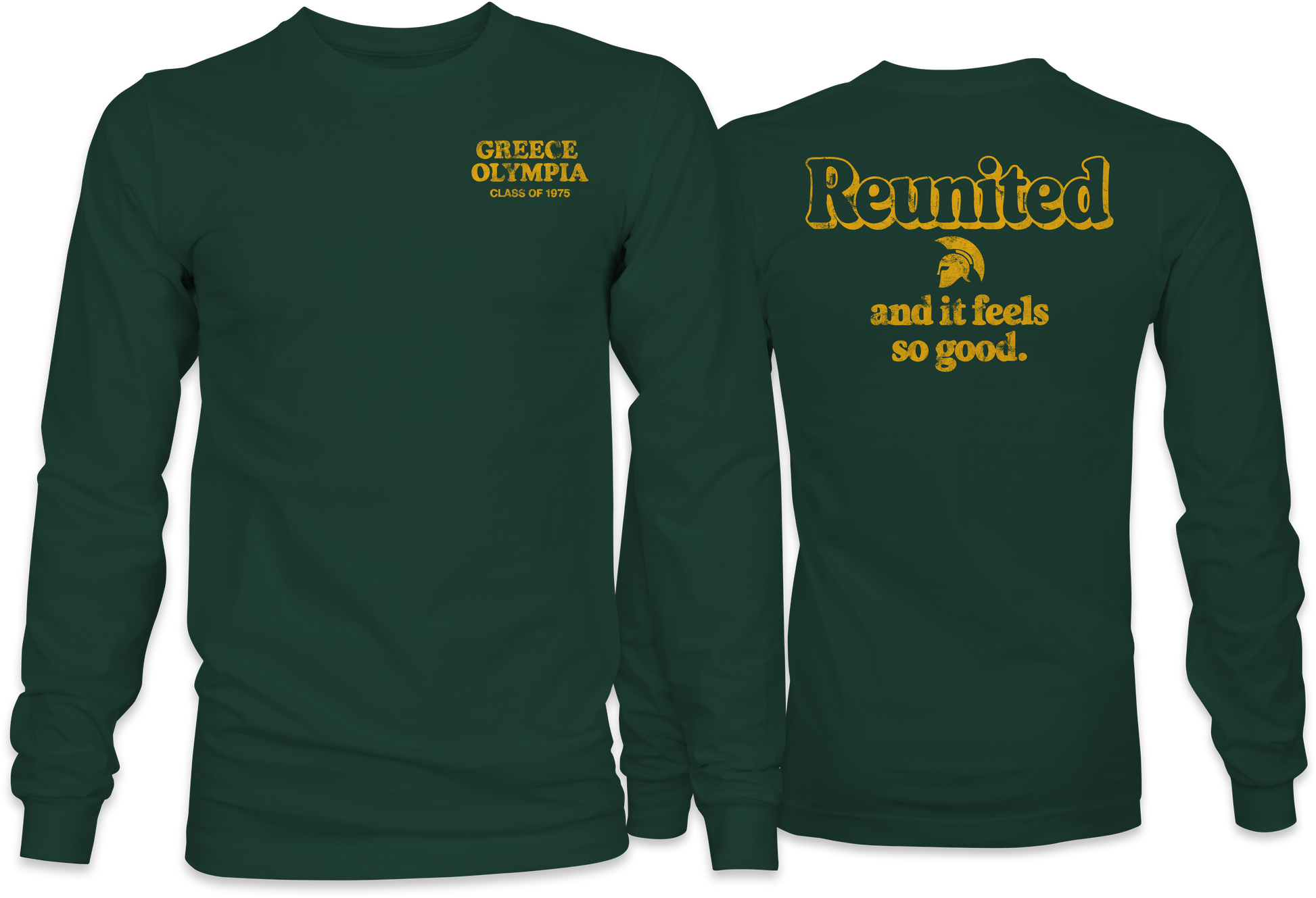 Get ready to celebrate the Greece Olympia Class of 1975’s 50th Reunion in style with this vintage "Reunited" tee in your school’s colors! This ultracomfy forest green Gildan Heavy Cotton Unisex Long-Sleeve shirt flaunts a distressed gold graphic on the front left chest, as well as on the full back.