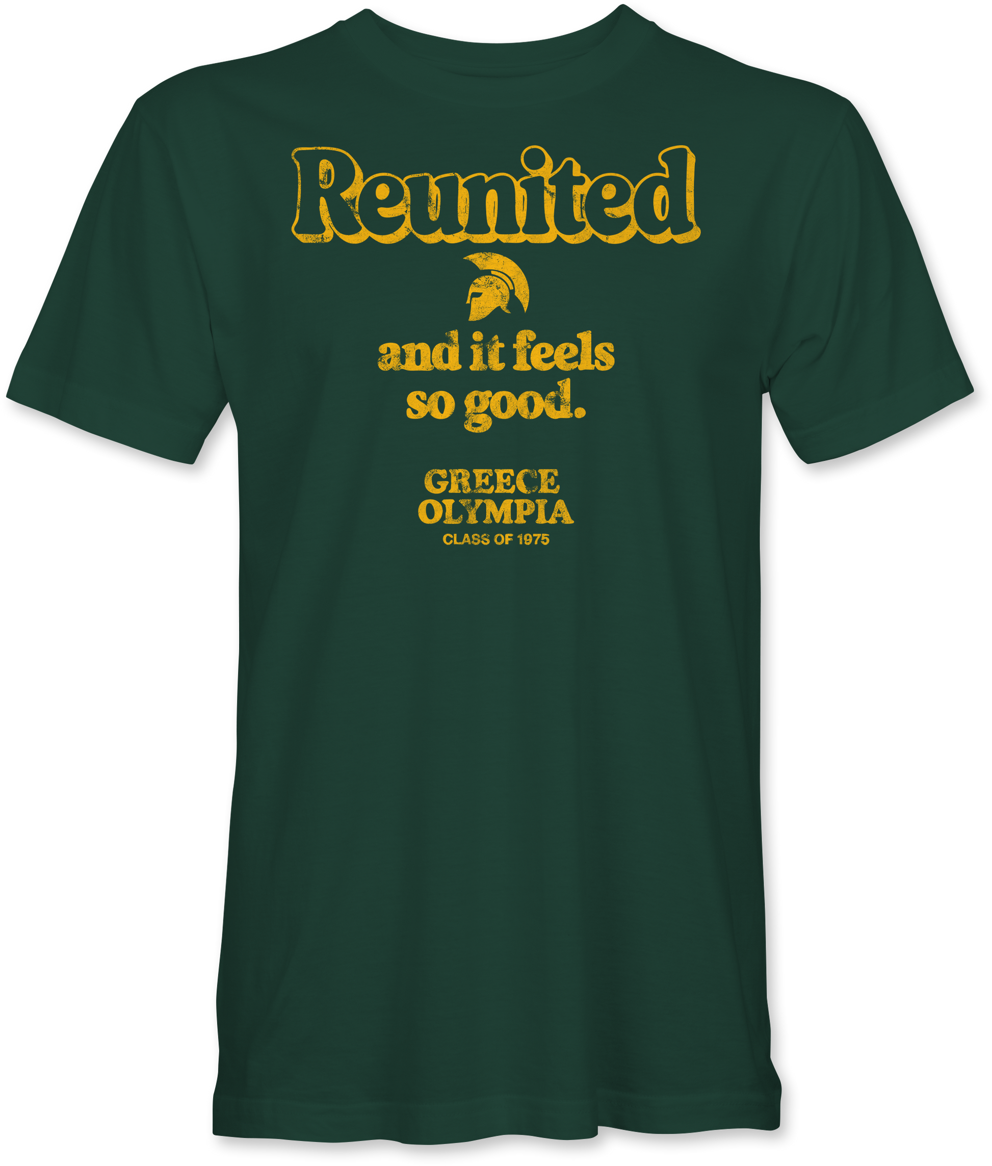 Get ready to celebrate the Greece Olympia Class of 1975’s 50th Reunion in style with this vintage "Reunited" tee in your school’s colors! This soft forest green Gildan Softstyle shirt flaunts a distressed gold graphic on the front.