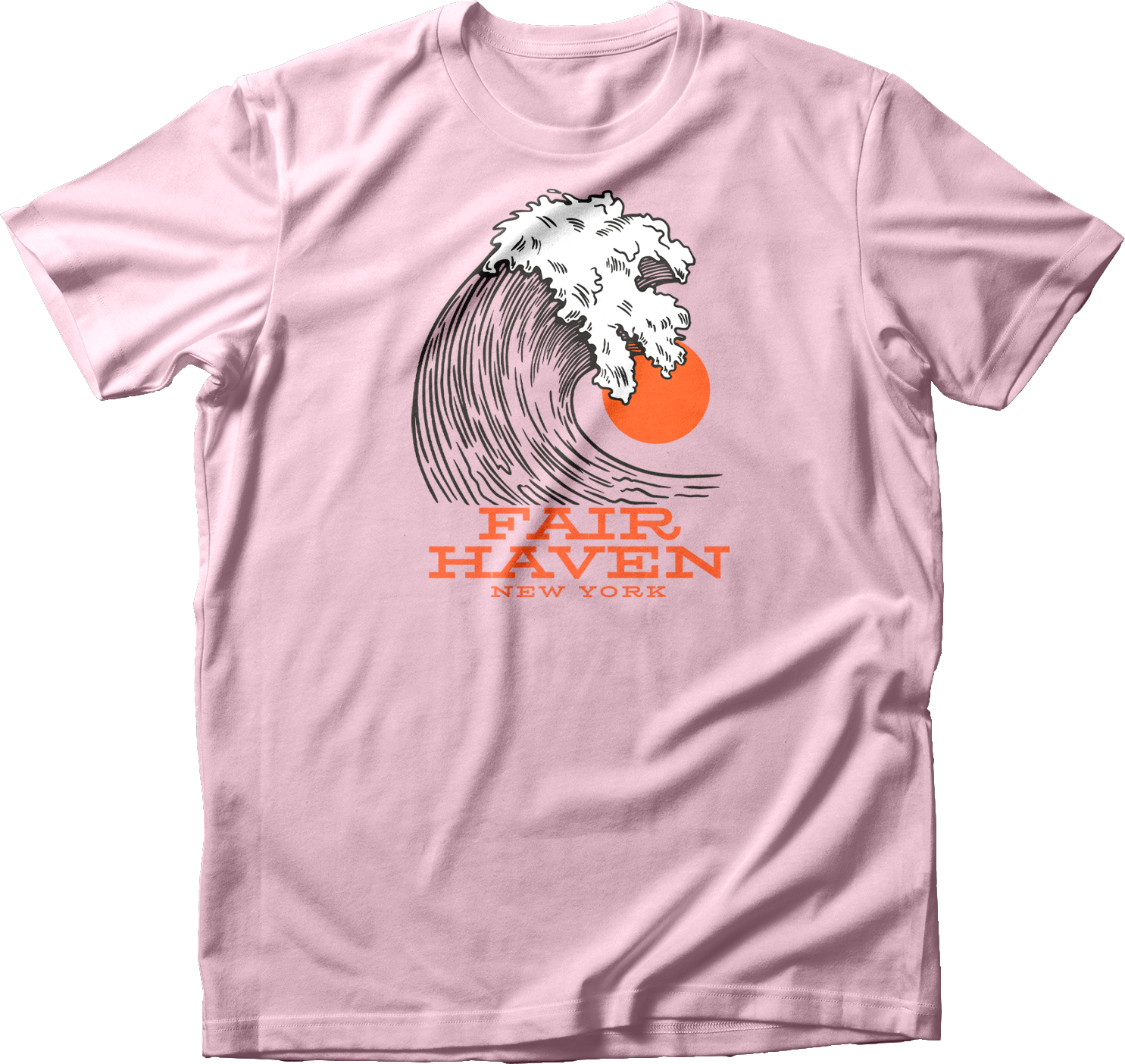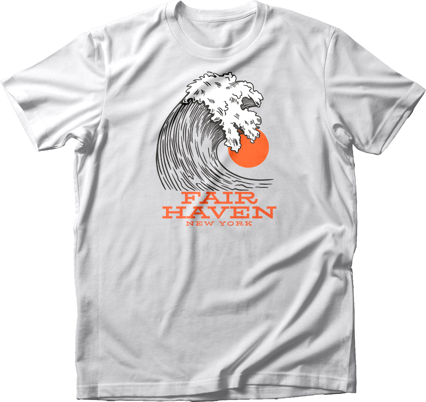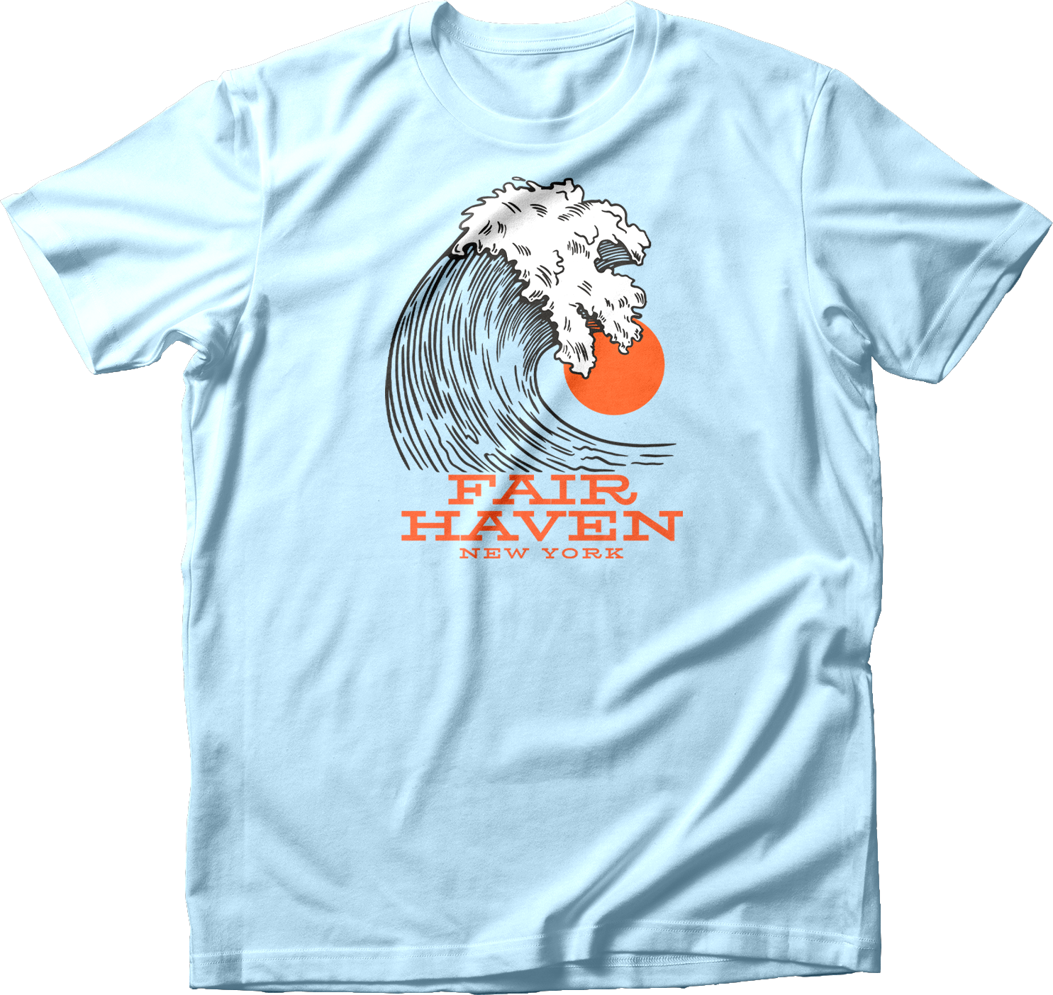 This illustrated design features a giant wave in front of a setting sun in Fair Haven, NY. The design is printed in full color on our ultrasoft Gildan Softstyle short-sleeve t-shirts, available in your choice of colors.