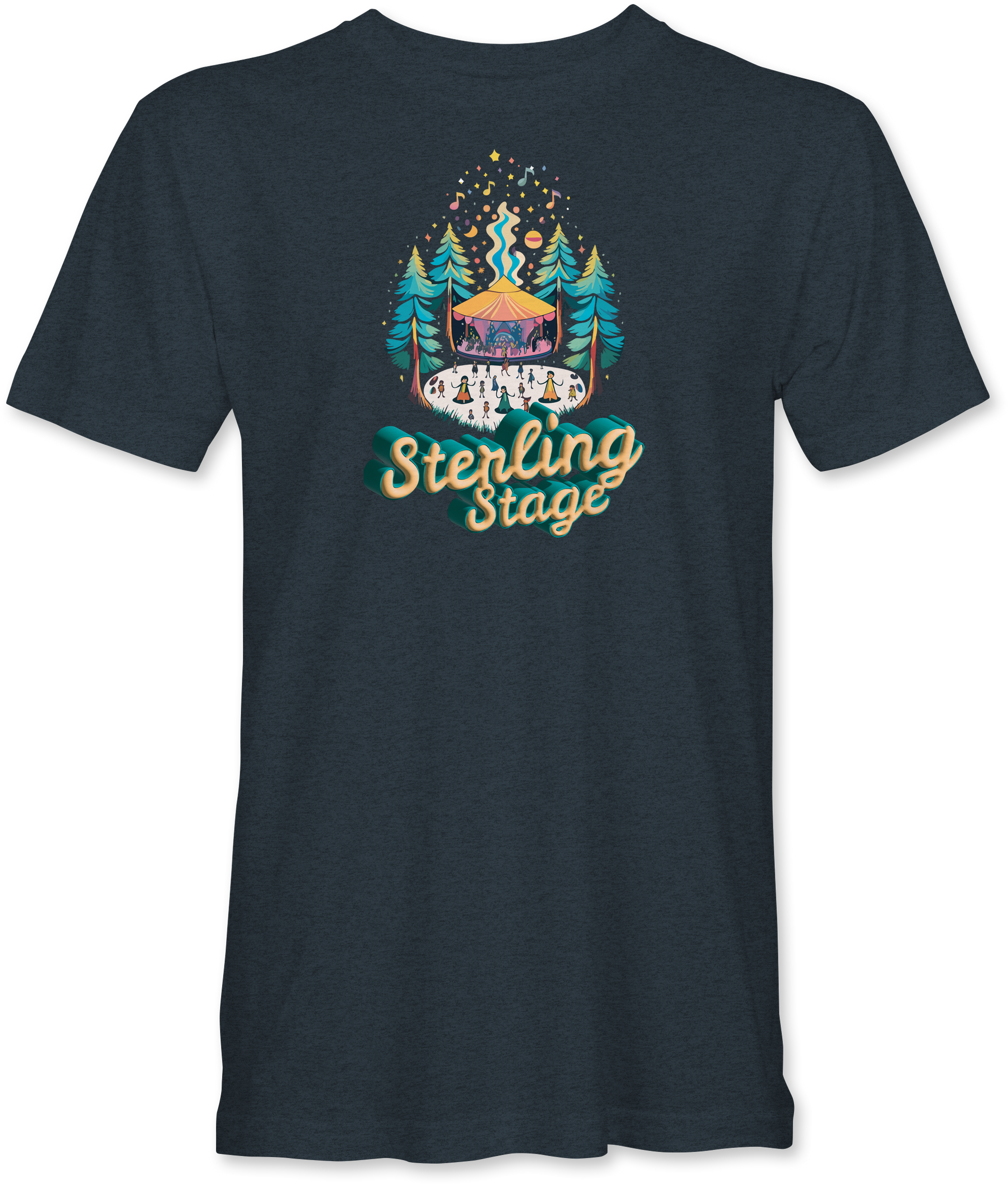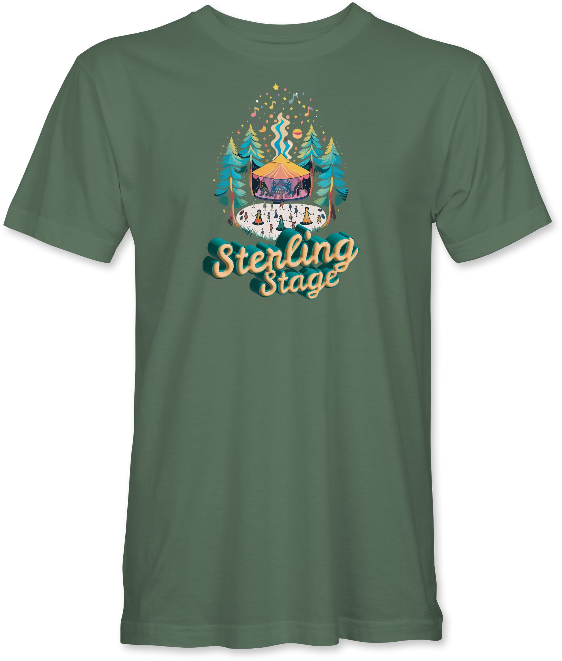 Celebrate 30 years of magic and music at Sterling Stage in Sterling, NY with this ultra-soft Gildan Softstyle unisex tee! This playful design features a spinning celestial stage and a crowd of dancers (find anyone you know?) nestled in the pines of Sterling, and is available in Military Green or Heather Navy.