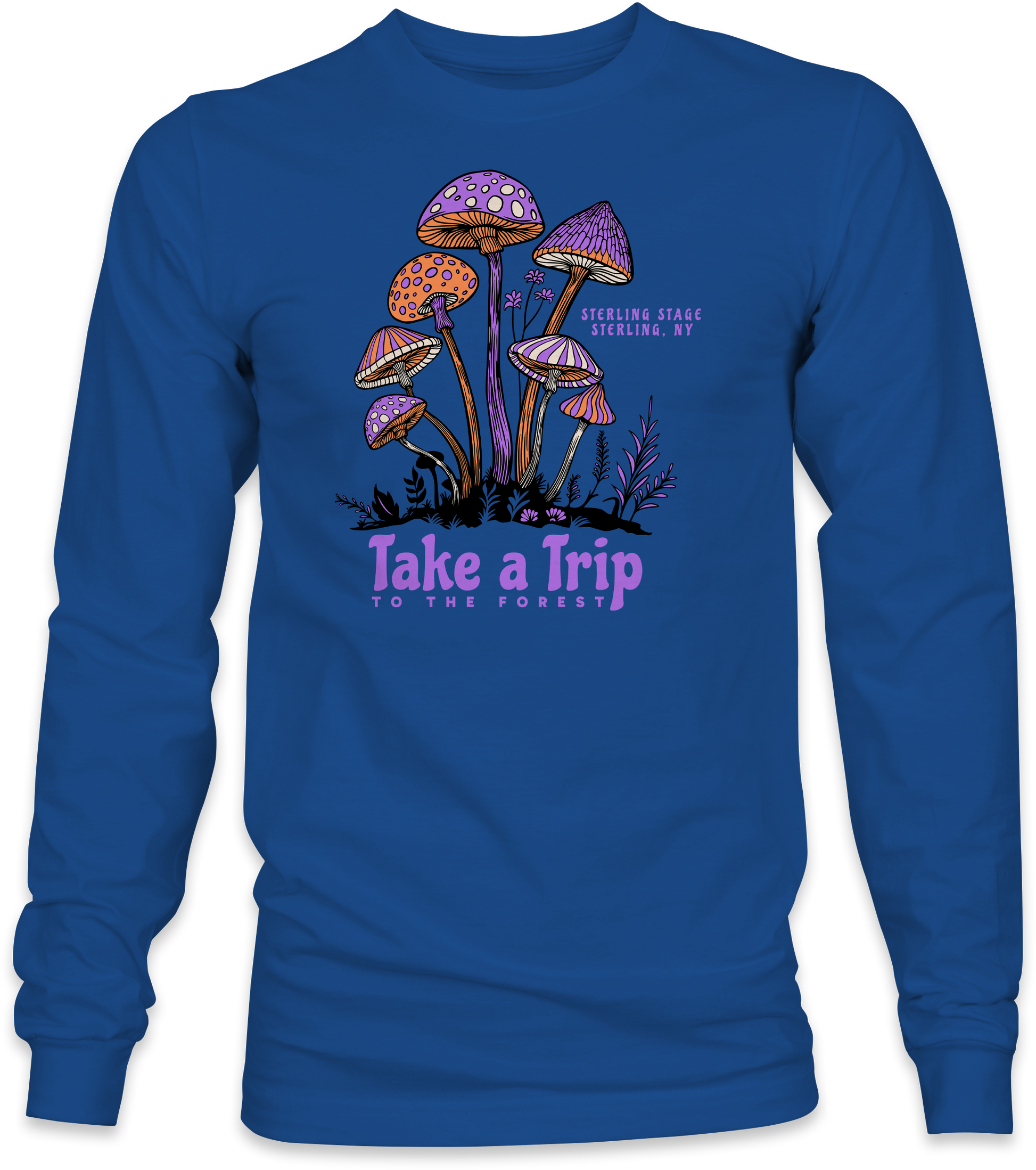 Get funky with fashion and celebrate Sterling Stage's 30th anniversary in this super cozy Take a Trip long-sleeve! Featuring a groovy shroom design and a playful invitation to spend time in the forest, this unisex Gildan Heavy Cotton long-sleeve is available in Royal Blue. The ultimate choice for getting down to some psychedelic beats!