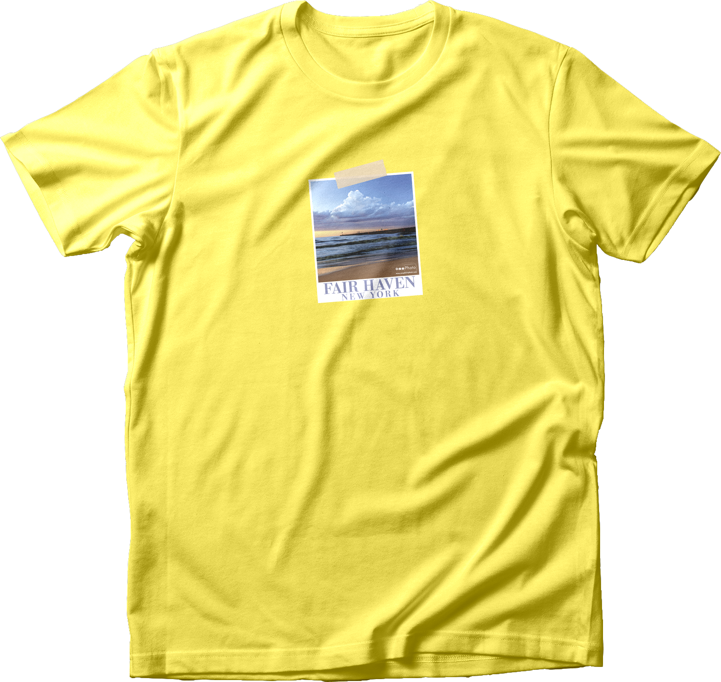 This T-shirt design features a genuine photo from onePhoto of Lake Ontario at the West Side Beach in Fair Haven, NY, printed in vibrant colors on our ultrasoft Gildan Softstyle short-sleeve t-shirts, available in your choice of colors.